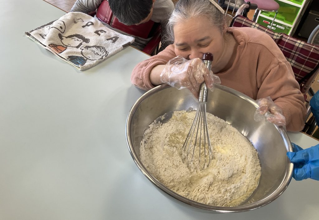 粉をまぜまぜして…焼いていきます❕